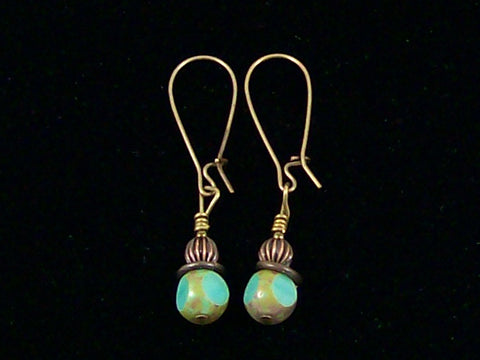 • Antiqued medium earrings• Beautiful Turquoise crystal beads with small jump rings• No lead, No nickle, and No green residue on the skin- very light weight• Length: 2 in from top of arch to bottom of beadClassic color goes with everything!